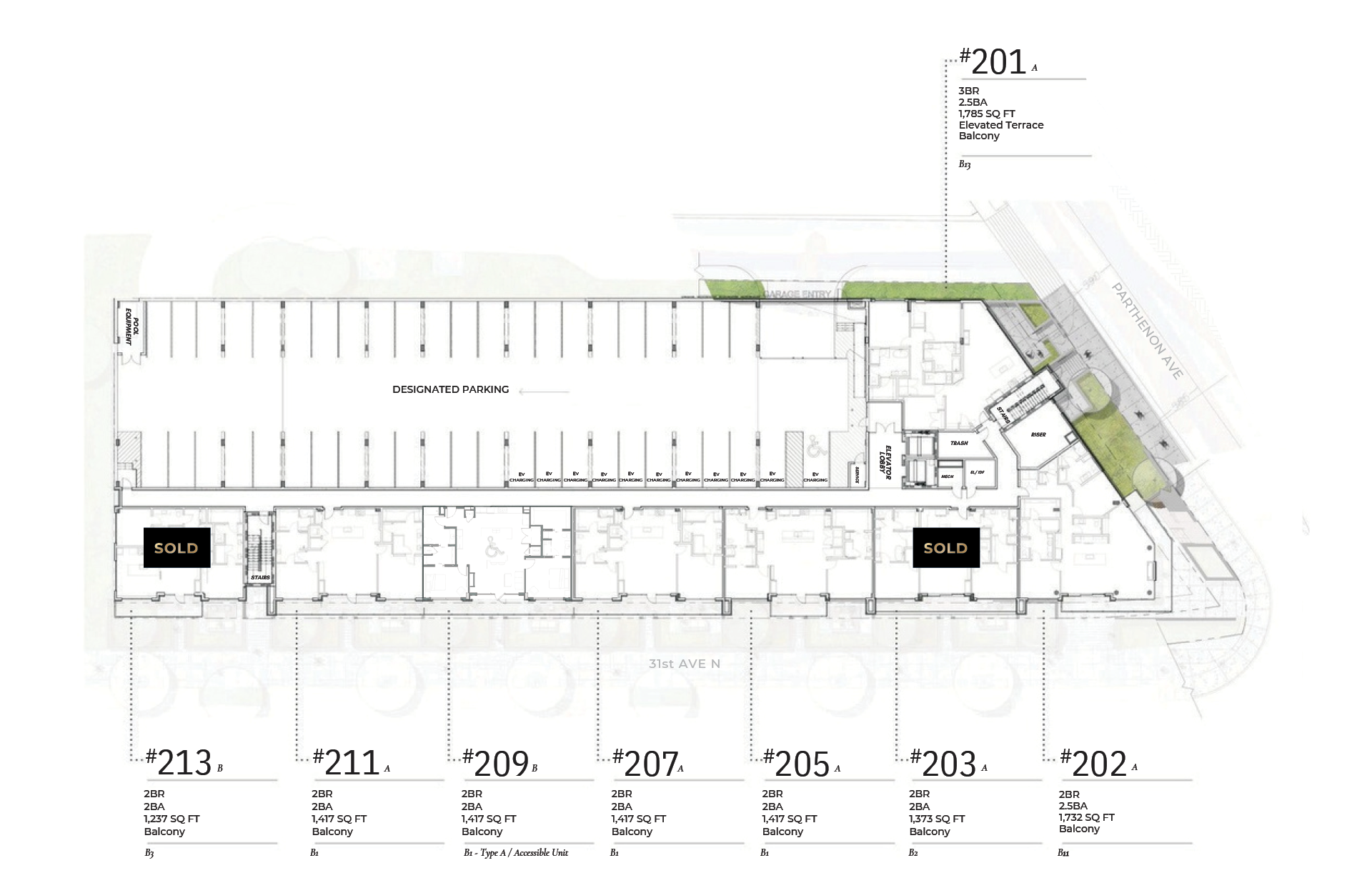 - The rooftop deck offers residents further entertainment space with skyline and Parthenon views, grilling space, fire pits, and large outdoor TV